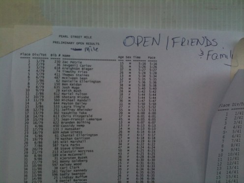 We all toed the line with 187 other, with me towards the front and Sagan and Al somewhere behind. A mile race is hard. Harder, in some ways, than a marathon or ultra-marathon. There is no real settling in period and, at least for me, pain from the starting gun. I was roughly stuck three deep in the start, having to maneuver around 25-30 others, with some stutter steps and lateral hops. Not exactly ideal in a race where every second counts but I just didn’t feel comfortable elbowing my way to the front of the start line, even in – especially in – the “friends and family” race, where I very much felt like the out-of-towner crashing an iconic, locals-centric race.