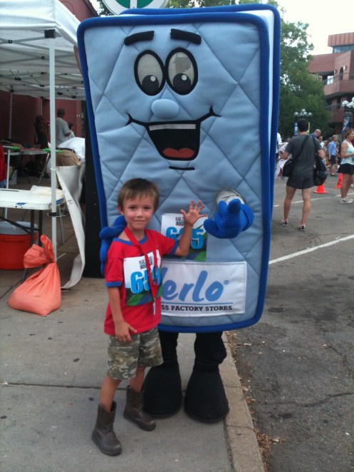 Right before the start of my race, which was to start just after the finish of the kid’s race, I saw a sad Sagan and flustered Alison at the registration table. Earlier, Sagan had dismissed our offer for him to run with the kids but, when he got to the race and saw all the kids finishing, he changed his mind. But, that race was just about over and, at any rate, too late for him to do. Alison saved the day, getting him and herself registered for the “friends and family” race, just before the race started. Since neither had planned to run a race, Al was in jeans and Sagan was wearing cowboy boots.