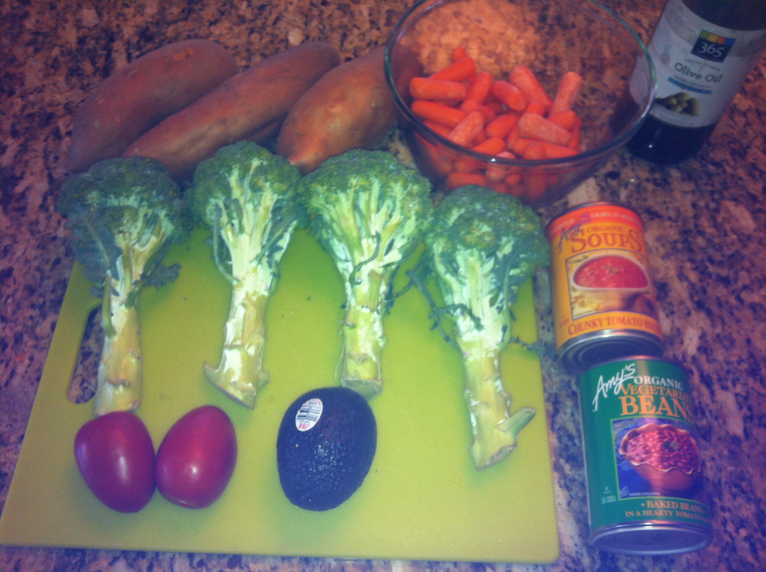Veggie: broccoli, tomatoes, and carrots – to be chopped and sauteed in just a little olive oil, then a can of Amy’s tomato bisque soup added and everything simmered together