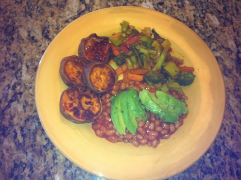 Protein: baked beans from a can, again from Amy’s. I add avocado to lots of stuff – partly to get more calories and good fat – so I’ll have some sliced over the beans.